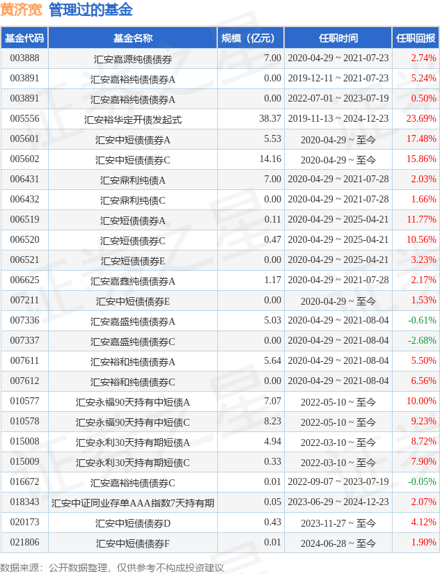 黄济宽先生:中国,研究生、硕士,固定收益投资部高级投资经理。英国纽卡斯尔大金融学硕士研究生,曾任西藏同信证券股份有限公司固定收益业务委员会产品管理总部投资主办人,新沃基金管理有限公司特定客户资产投资部投资经理,华创证券有限责任公司资产管理总部高级投资经理。2019年9月加入汇安基金管理有限责任公司,担任绝对收益组基金经理。2019年12月11日至2021年7月23日、2022年7月1日至2023年7月19日,任汇安嘉裕纯债债券型证券投资基金基金经理;2020年4月29日至2021年7月23日,任汇安嘉源纯债债券型证券投资基金基金经理;2020年4月29日至2021年7月28日,任汇安嘉鑫纯债债券型证券投资基金基金经理;2020年4月29日至2021年7月28日,任汇安鼎利纯债债券型证券投资基金基金经理;2020年4月29日至2021年8月4日,任汇安嘉盛纯债债券型证券投资基金基金经理;2020年4月29日至2021年8月4日,任汇安裕和纯债债券型证券投资基金基金经理;2020年4月29日至2025年4月21日,任汇安短债债券型证券投资基金基金经理;2020年4月29日至今,任汇安中短债债券型证券投资基金基金经理;2022年3月10日至今,任汇安永利30天持有期短债债券型证券投资基金基金经理;2022年5月10日至今,任汇安永福90天持有期中短债债券型证券投资基金基金经理;2023年6月29日至2024年12月23日任汇安中证同业存单AAA指数7天持有期证券投资基金基金经理。曾任汇安裕华纯债定期开放债券型发起式证券投资基金基金经理。