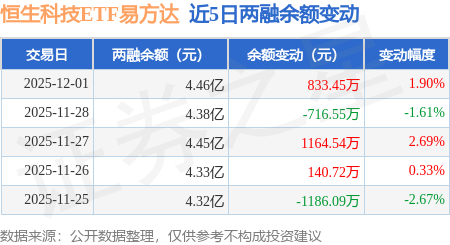 证券之星消息,12月1日,恒生科技ETF易方达(513010)融资买入1.21亿元,融资偿还1.13亿元,融资净买入833.45万元,融资余额4.46亿元,近20个交易日中有12个交易日出现融资净买入。