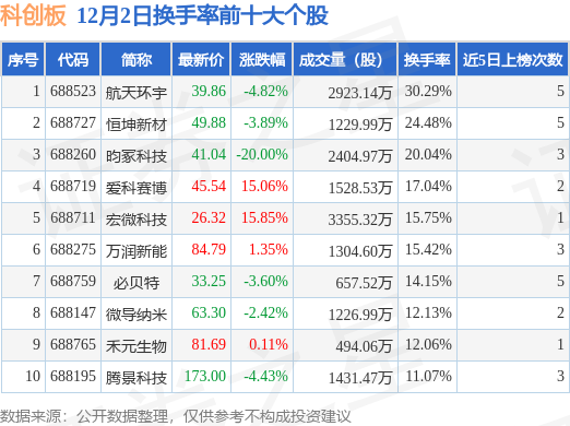 当日科创板换手率前10大个股中4只个股收涨,平均涨幅8.09%,其中航天环宇(688523)以换手率30.29%排第一,8只个股近5个交易日中多次上榜。
