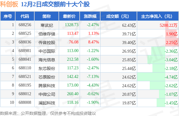 当日科创板成交额前10大个股中2只个股收涨,平均涨幅4.8%,其中寒武纪(688256)以成交额62.43亿元排第一。从主力资金流入看,成交额前10大个股中有3只个股呈现主力资金净流入。
