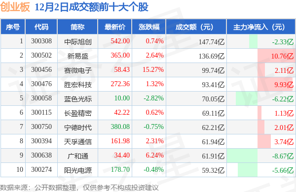当日创业板成交额前10大个股中7只个股收涨,平均涨幅4.16%,其中中际旭创(300308)以成交额147.74亿元排第一。从主力资金流入看,成交额前10大个股中有6只个股呈现主力资金净流入。