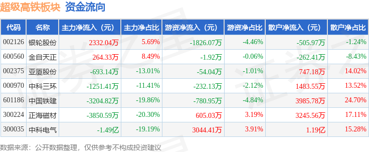 从资金流向上来看,当日超级高铁板块主力资金净流出2.14亿元,游资资金净流入754.33万元,散户资金净流入2.06亿元。超级高铁板块个股资金流向见下表: