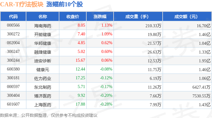 从资金流向上来看,当日CAR-T疗法板块主力资金净流出7.47亿元,游资资金净流入2.25亿元,散户资金净流入5.22亿元。CAR-T疗法板块个股资金流向见下表: