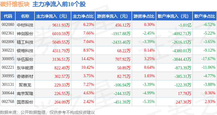 从资金流向上来看,当日碳纤维板块主力资金净流出6.01亿元,游资资金净流入5929.56万元,散户资金净流入5.42亿元。碳纤维板块个股资金流向见下表: