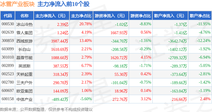 从资金流向上来看,当日冰雪产业板块主力资金净流出2.18亿元,游资资金净流入2.02亿元,散户资金净流入1591.77万元。冰雪产业板块个股资金流向见下表: