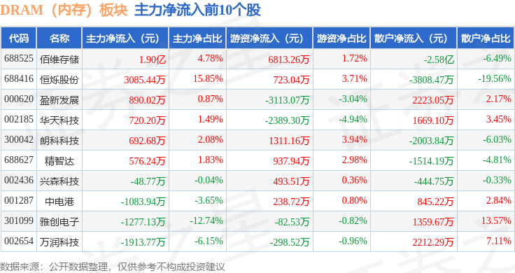从资金流向上来看,当日DRAM(内存)板块主力资金净流出41.16亿元,游资资金净流入6.42亿元,散户资金净流入34.73亿元。DRAM(内存)板块个股资金流向见下表: