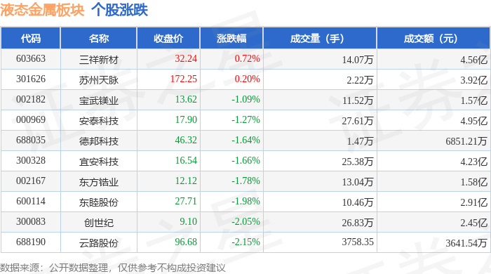 证券之星消息,12月2日液态金属板块较上一交易日下跌1.29%,云路股份领跌。当日上证指数报收于3897.71,下跌0.42%。深证成指报收于13056.7,下跌0.68%。液态金属板块个股涨跌见下表: