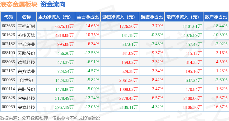 从资金流向上来看,当日液态金属板块主力资金净流出3814.7万元,游资资金净流入5786.08万元,散户资金净流出1971.37万元。液态金属板块个股资金流向见下表: