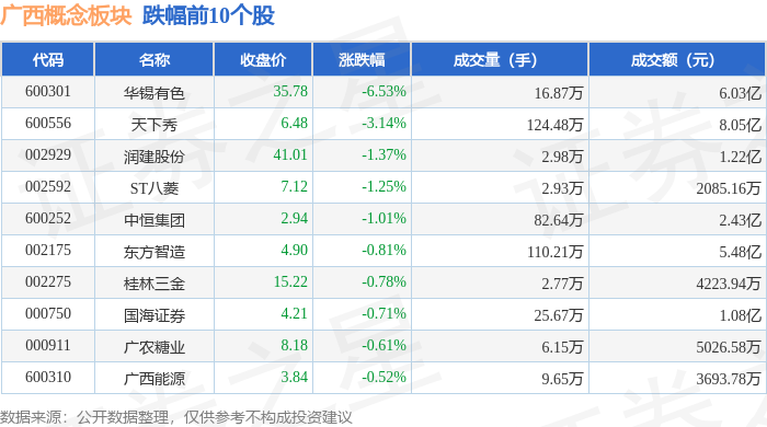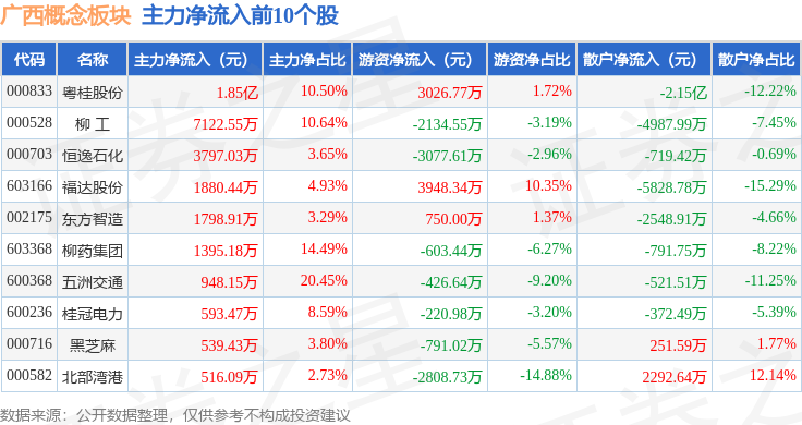 从资金流向上来看,当日广西概念板块主力资金净流入1.23亿元,游资资金净流出2713.75万元,散户资金净流出9571.36万元。广西概念板块个股资金流向见下表: