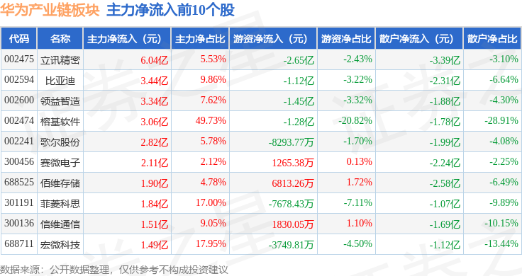 从资金流向上来看,当日华为产业链板块主力资金净流出82.29亿元,游资资金净流入25.39亿元,散户资金净流入56.9亿元。华为产业链板块个股资金流向见下表: