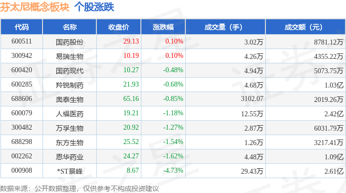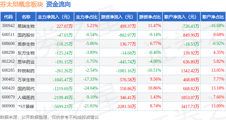 从资金流向上来看,当日芬太尼概念板块主力资金净流出1.07亿元,游资资金净流入2046.95万元,散户资金净流入8632.78万元。芬太尼概念板块个股资金流向见下表: