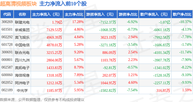 从资金流向上来看,当日超高清视频板块主力资金净流出63.81亿元,游资资金净流入15.56亿元,散户资金净流入48.24亿元。超高清视频板块个股资金流向见下表: