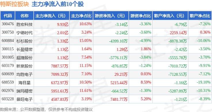 从资金流向上来看,当日特斯拉板块主力资金净流出47.92亿元,游资资金净流入7.98亿元,散户资金净流入39.94亿元。特斯拉板块个股资金流向见下表: