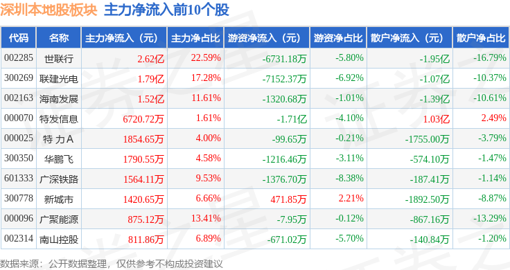 从资金流向上来看,当日深圳本地股板块主力资金净流出11.28亿元,游资资金净流入3347.08万元,散户资金净流入10.94亿元。深圳本地股板块个股资金流向见下表: