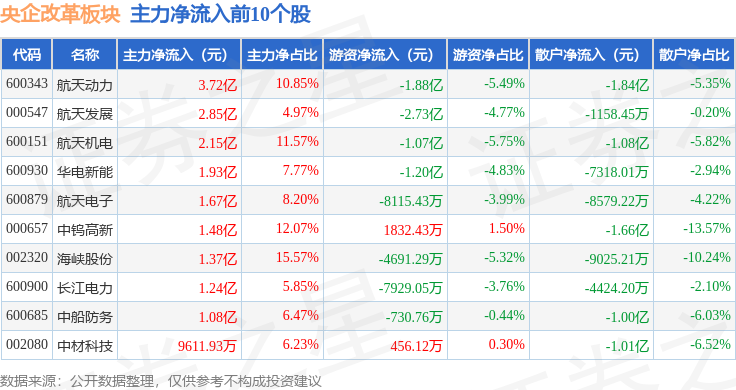 从资金流向上来看,当日央企改革板块主力资金净流出30.21亿元,游资资金净流出3.45亿元,散户资金净流入33.66亿元。央企改革板块个股资金流向见下表: