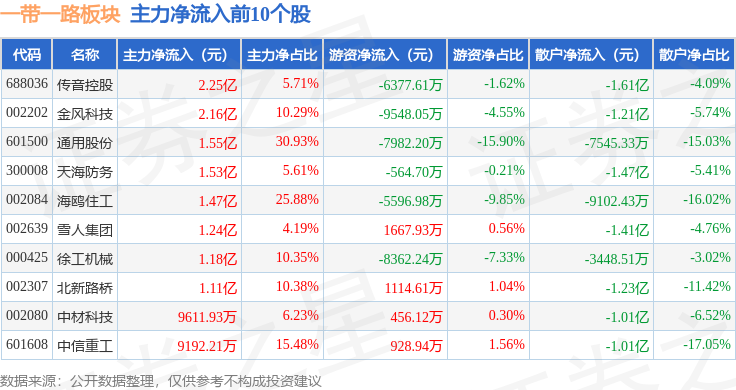 从资金流向上来看,当日一带一路板块主力资金净流出75.51亿元,游资资金净流入12.67亿元,散户资金净流入62.84亿元。一带一路板块个股资金流向见下表: