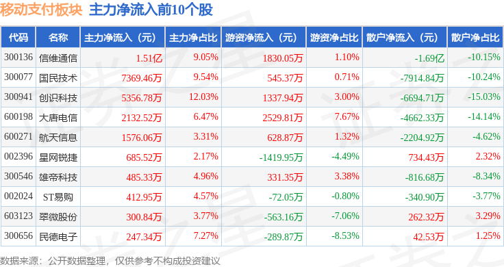 从资金流向上来看,当日移动支付板块主力资金净流出27.66亿元,游资资金净流入10.4亿元,散户资金净流入17.25亿元。移动支付板块个股资金流向见下表: