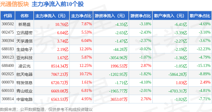 从资金流向上来看,当日光通信板块主力资金净流出45.79亿元,游资资金净流入7.3亿元,散户资金净流入38.49亿元。光通信板块个股资金流向见下表: