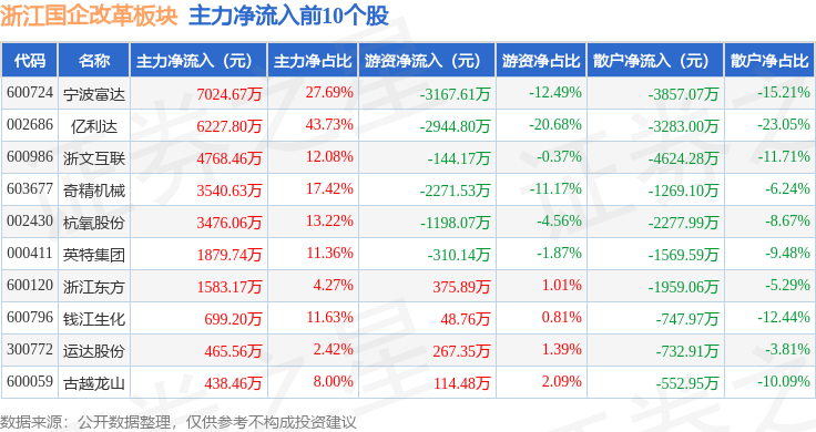 从资金流向上来看,当日浙江国企改革板块主力资金净流出6519.87万元,游资资金净流出7917.85万元,散户资金净流入1.44亿元。浙江国企改革板块个股资金流向见下表:
