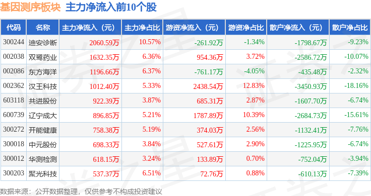 从资金流向上来看,当日基因测序板块主力资金净流出3.54亿元,游资资金净流入1.42亿元,散户资金净流入2.12亿元。基因测序板块个股资金流向见下表: