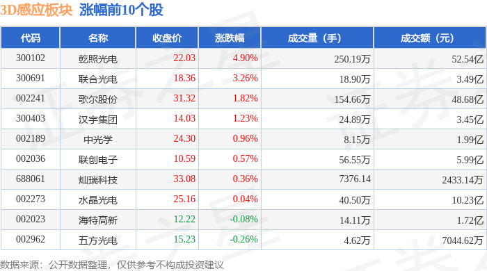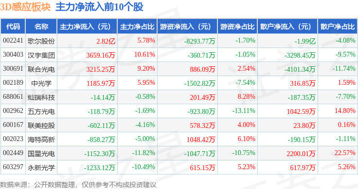 从资金流向上来看,当日3D感应板块主力资金净流出6.91亿元,游资资金净流入7945.49万元,散户资金净流入6.12亿元。3D感应板块个股资金流向见下表: