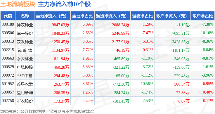 从资金流向上来看,当日土地流转板块主力资金净流出1.55亿元,游资资金净流入1.52亿元,散户资金净流入280.35万元。土地流转板块个股资金流向见下表: