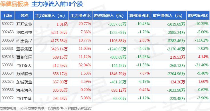 从资金流向上来看,当日保健品板块主力资金净流出7.09亿元,游资资金净流入240.04万元,散户资金净流入7.07亿元。保健品板块个股资金流向见下表: