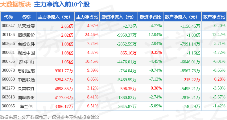 从资金流向上来看,当日大数据板块主力资金净流出102.69亿元,游资资金净流入29.93亿元,散户资金净流入72.76亿元。大数据板块个股资金流向见下表: