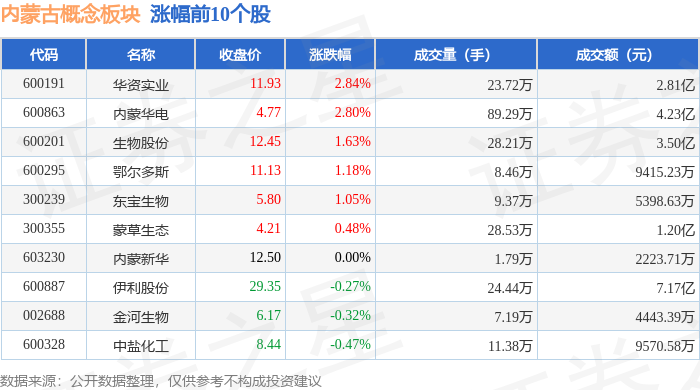 从资金流向上来看,当日内蒙古概念板块主力资金净流出9.53亿元,游资资金净流入3.72亿元,散户资金净流入5.81亿元。内蒙古概念板块个股资金流向见下表: