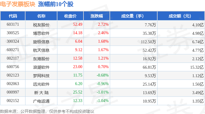 证券之星消息,12月2日电子发票板块较上一交易日下跌1.02%,石基信息领跌。当日上证指数报收于3897.71,下跌0.42%。深证成指报收于13056.7,下跌0.68%。电子发票板块个股涨跌见下表: