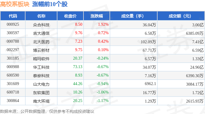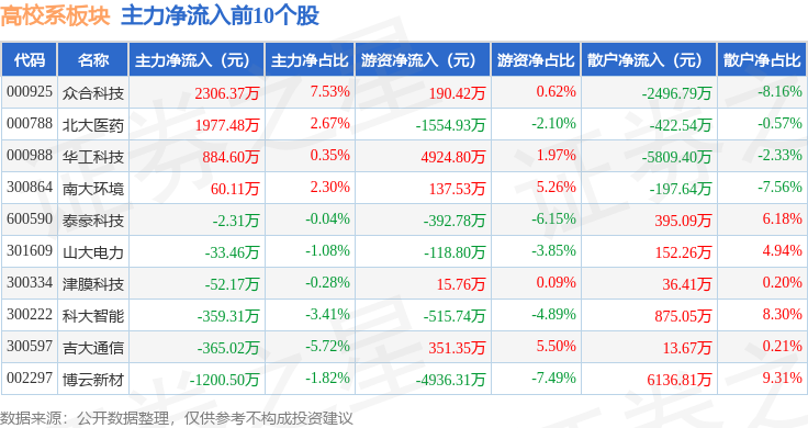 从资金流向上来看,当日高校系板块主力资金净流出3.84亿元,游资资金净流入1.1亿元,散户资金净流入2.74亿元。高校系板块个股资金流向见下表: