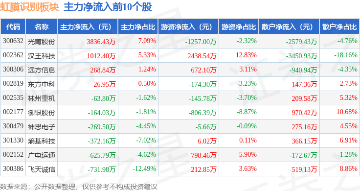 从资金流向上来看,当日虹膜识别板块主力资金净流出3.45亿元,游资资金净流出6112.99万元,散户资金净流入4.07亿元。虹膜识别板块个股资金流向见下表:
