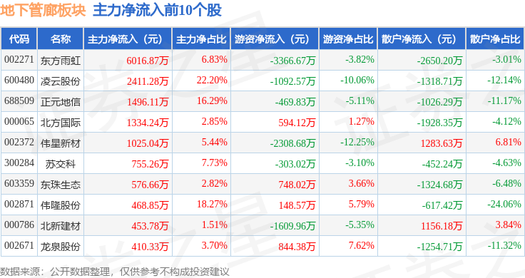 从资金流向上来看,当日地下管廊板块主力资金净流出1.11亿元,游资资金净流出4309.32万元,散户资金净流入1.54亿元。地下管廊板块个股资金流向见下表: