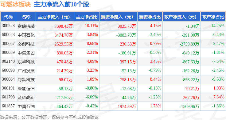 从资金流向上来看,当日可燃冰板块主力资金净流出3.82亿元,游资资金净流入1.56亿元,散户资金净流入2.26亿元。可燃冰板块个股资金流向见下表: