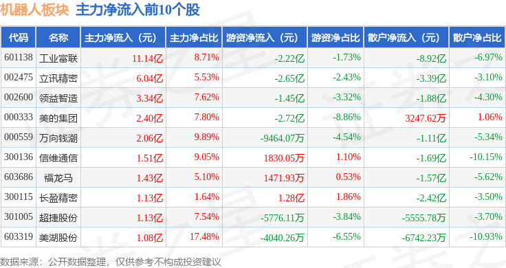 从资金流向上来看,当日机器人板块主力资金净流出60.15亿元,游资资金净流入17.27亿元,散户资金净流入42.88亿元。机器人板块个股资金流向见下表: