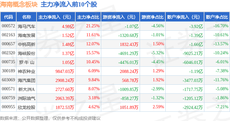 从资金流向上来看,当日海南概念板块主力资金净流入7.85亿元,游资资金净流出1.33亿元,散户资金净流出6.52亿元。海南概念板块个股资金流向见下表: