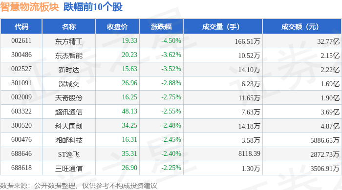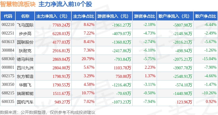 从资金流向上来看,当日智慧物流板块主力资金净流出10.29亿元,游资资金净流入1.92亿元,散户资金净流入8.37亿元。智慧物流板块个股资金流向见下表:
