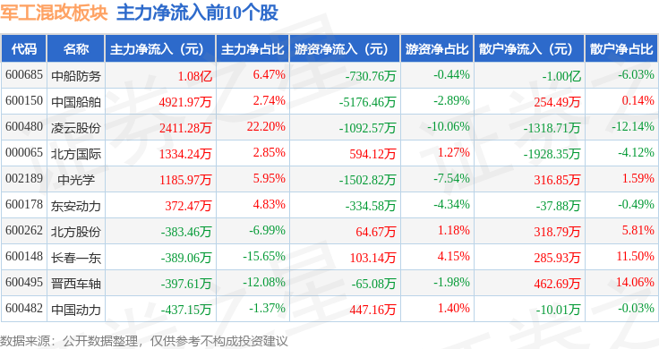 从资金流向上来看,当日军工混改板块主力资金净流出2.03亿元,游资资金净流出4840.82万元,散户资金净流入2.51亿元。军工混改板块个股资金流向见下表: