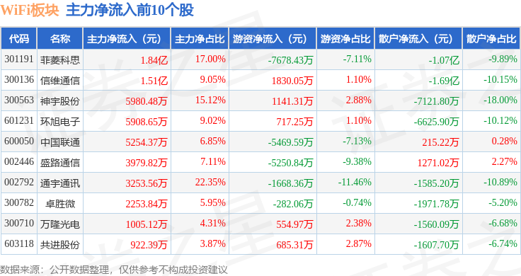 从资金流向上来看,当日WiFi板块主力资金净流出38.39亿元,游资资金净流入14.97亿元,散户资金净流入23.42亿元。WiFi板块个股资金流向见下表: