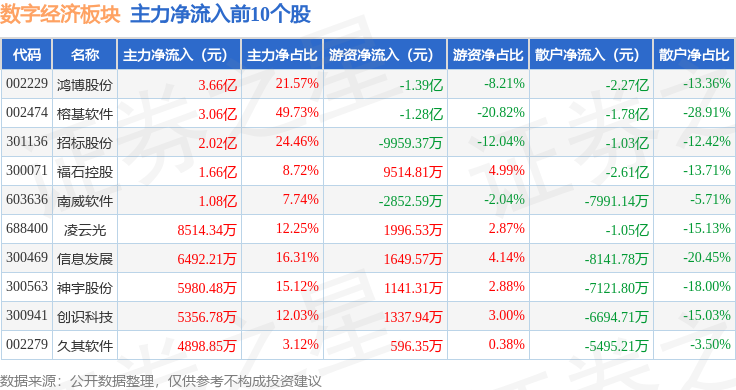 从资金流向上来看,当日数字经济板块主力资金净流出79.56亿元,游资资金净流入28.35亿元,散户资金净流入51.21亿元。数字经济板块个股资金流向见下表: