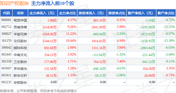 从资金流向上来看,当日知识产权板块主力资金净流出5.08亿元,游资资金净流入3.36亿元,散户资金净流入1.72亿元。知识产权板块个股资金流向见下表: