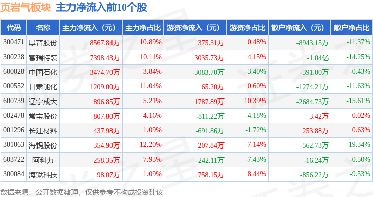 从资金流向上来看,当日页岩气板块主力资金净流出3.15亿元,游资资金净流入1.89亿元,散户资金净流入1.26亿元。页岩气板块个股资金流向见下表:
