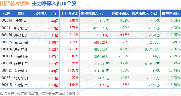 从资金流向上来看,当日国产芯片板块主力资金净流出124.3亿元,游资资金净流入40.61亿元,散户资金净流入83.68亿元。国产芯片板块个股资金流向见下表: