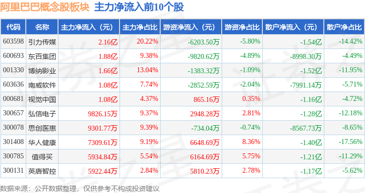 从资金流向上来看,当日阿里巴巴概念股板块主力资金净流出64.51亿元,游资资金净流入24.15亿元,散户资金净流入40.37亿元。阿里巴巴概念股板块个股资金流向见下表: