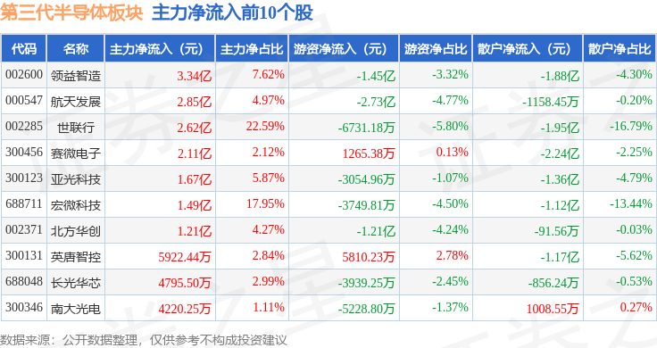 从资金流向上来看,当日第三代半导体板块主力资金净流出47.71亿元,游资资金净流入11.52亿元,散户资金净流入36.18亿元。第三代半导体板块个股资金流向见下表: