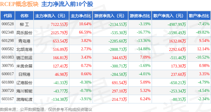 从资金流向上来看,当日RCEP概念板块主力资金净流出3753.57万元,游资资金净流出4046.69万元,散户资金净流入7800.26万元。RCEP概念板块个股资金流向见下表: