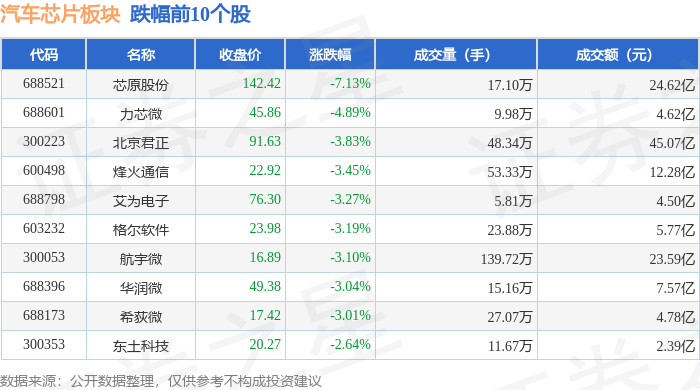 证券之星消息,12月2日汽车芯片板块较上一交易日下跌1.52%,芯原股份领跌。当日上证指数报收于3897.71,下跌0.42%。深证成指报收于13056.7,下跌0.68%。汽车芯片板块个股涨跌见下表: