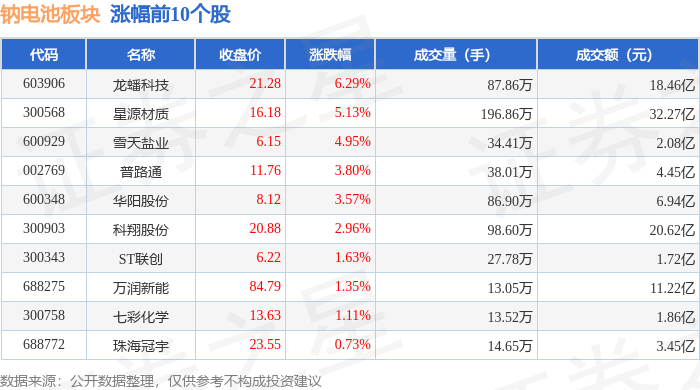 从资金流向上来看,当日钠电池板块主力资金净流出23.88亿元,游资资金净流入9075.51万元,散户资金净流入22.98亿元。钠电池板块个股资金流向见下表: