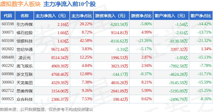 从资金流向上来看,当日虚拟数字人板块主力资金净流出12.66亿元,游资资金净流入5.92亿元,散户资金净流入6.74亿元。虚拟数字人板块个股资金流向见下表: