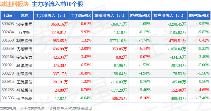 从资金流向上来看,当日减速器板块主力资金净流出16.24亿元,游资资金净流入2.04亿元,散户资金净流入14.2亿元。减速器板块个股资金流向见下表: